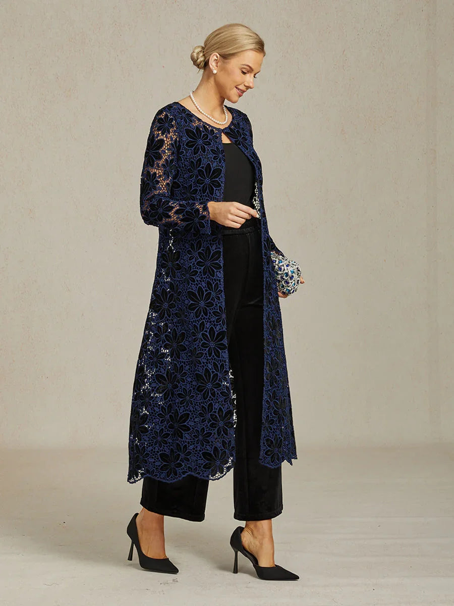 This longline velvet jacket features intricate floral embroidery and a stylish scallop hem, creating a sophisticated and feminine look. The long sleeves provide elegant coverage, while the luxurious velvet fabric adds texture and richness to your outfit. Perfect for layering over dresses, skirts, or trousers for formal events or upscale casual occasions.