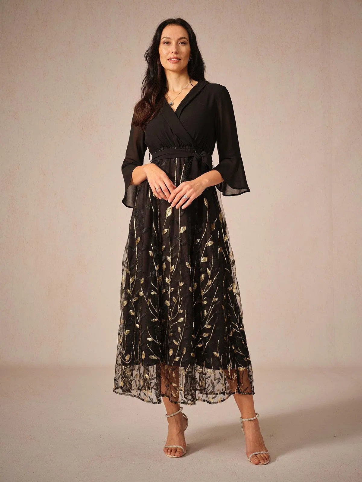 Designed with a?refined lapel neckline?and?soft chiffon bodice, this elegant midi dress features?3/4 flared sleeves?and a?comfortable elastic waist for an easy, flattering fit.?A detachable chiffon tie?cinches the waist for added shape. The?lower half shimmers with intricate sequin embroidery, gracefully flowing to a mid-calf hem. Perfectly combining structure and softness, it¡¯s an ideal choice for?semi-formal evenings and special daytime events.