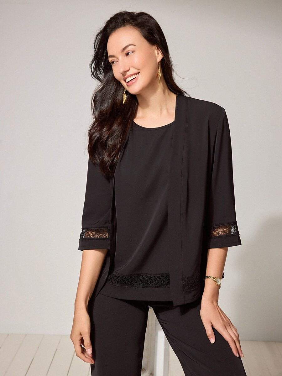 - Design: Includes a lace-trimmed tank and matching 3/4 sleeve cardigan for a chic layered look.
