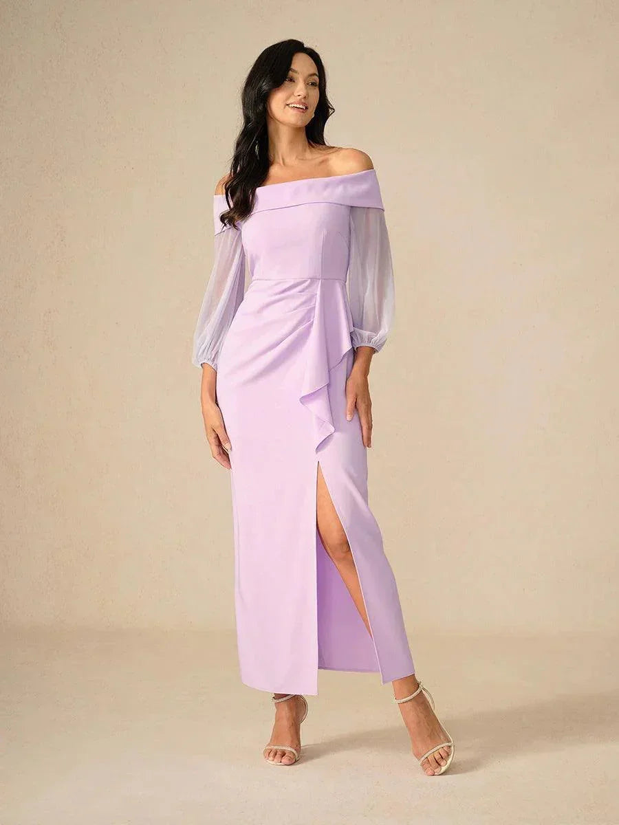 This elegant?off-shoulder square neckline?evening gown features?stretchy, breathable fabric?for comfort and a?hidden back zipper?for a sleek fit. The?ankle-length skirt?is designed with a?thigh-high side slit?and?cascading ruffles?adding a romantic touch.?Soft sheer mesh long sleeves?provide a delicate and skin-friendly feel. Perfect for formal spring and summer events.