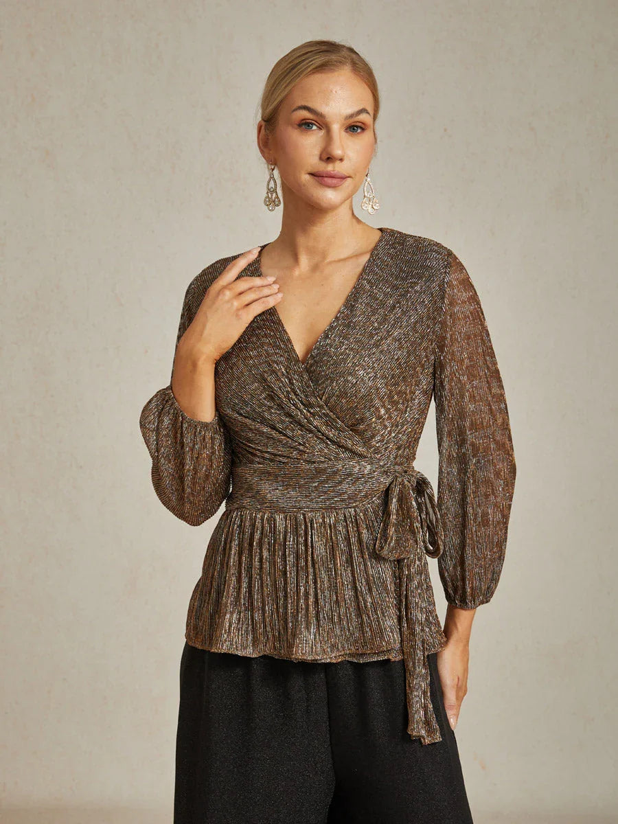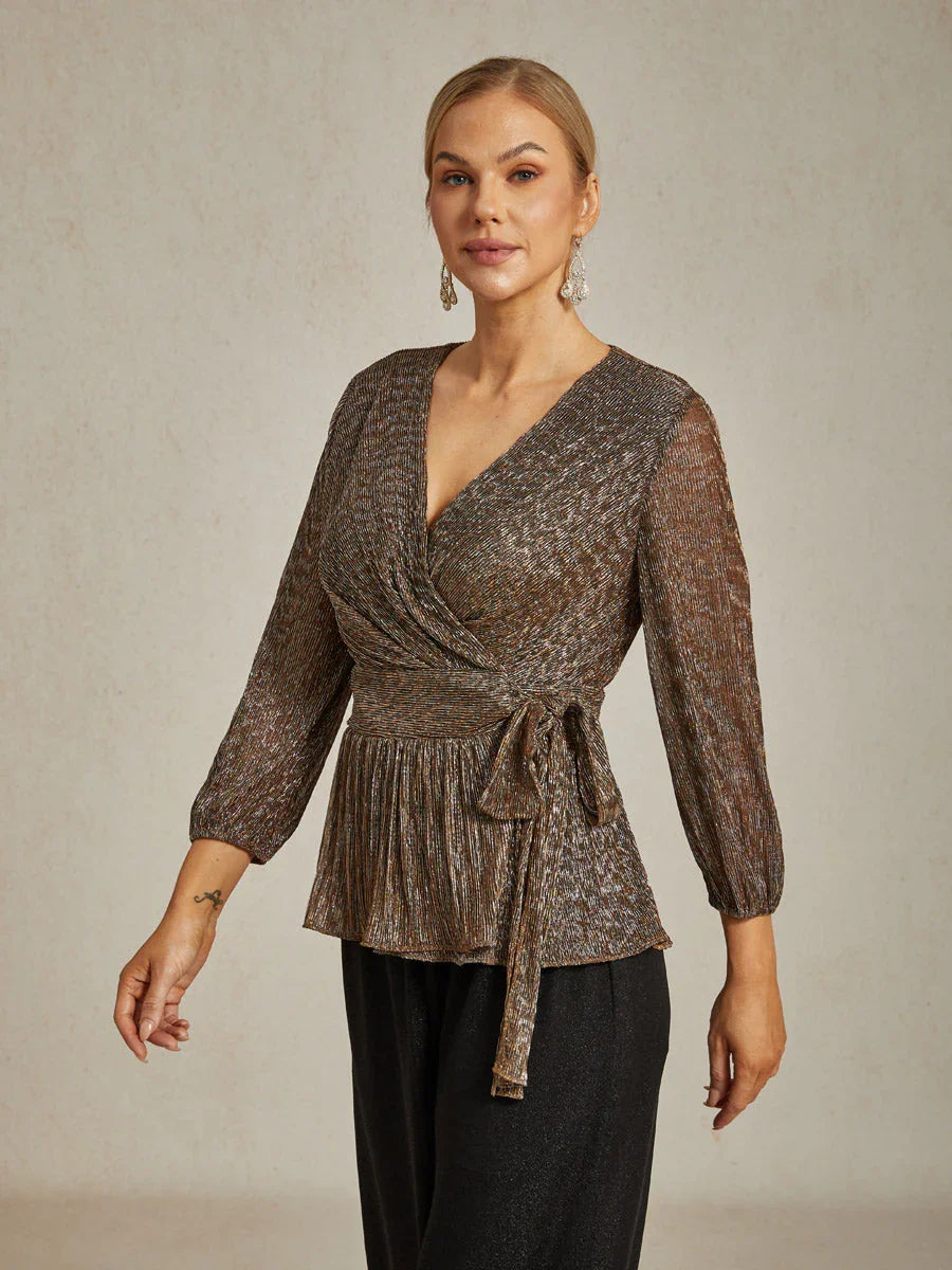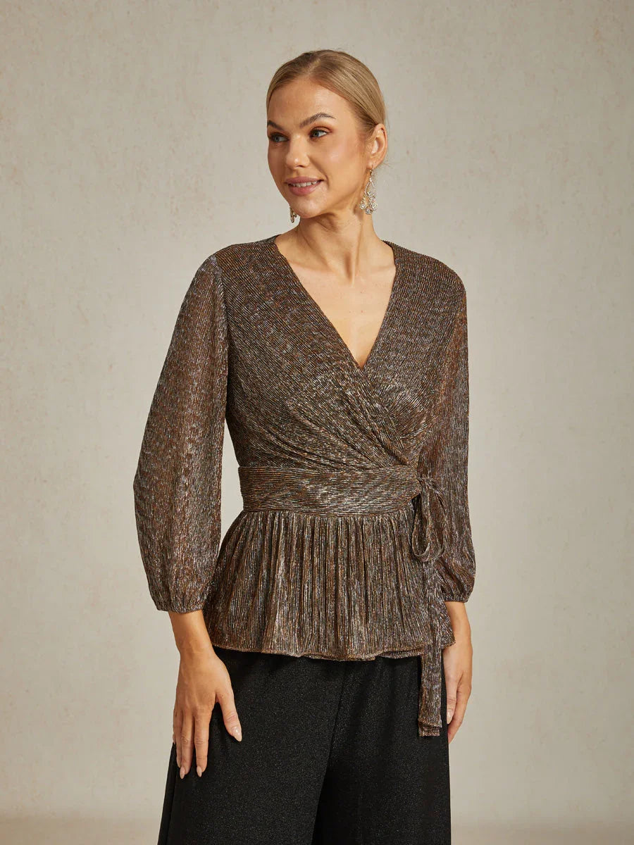 Shine effortlessly in this metallic pleated chiffon wrap top, designed to flatter with a feminine silhouette. The elegant wrap style highlights the waist while offering a graceful drape, complemented by 3/4 sleeves with elastic cuffs and a comfortable stretch lining for all-day comfort. Crafted from?lightweight shimmering pleated chiffon, this blouse brings both sophistication and versatility.Perfect for pairing with skirts, trousers, this versatile piece is ideal for evening events, parties, or festive gatherings.