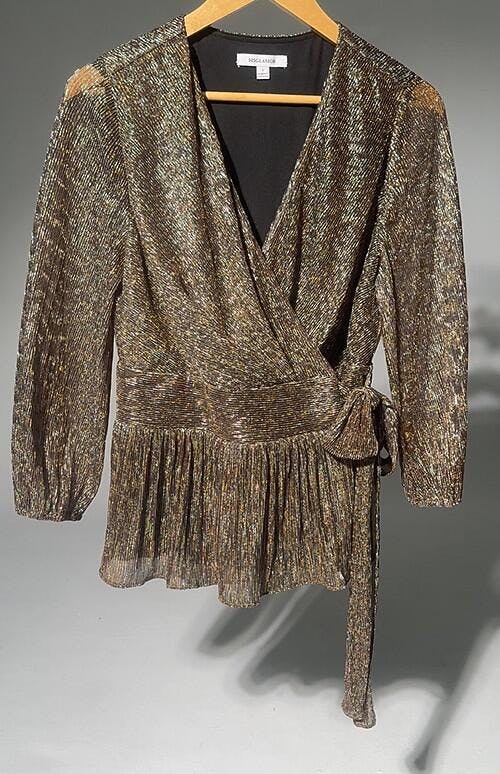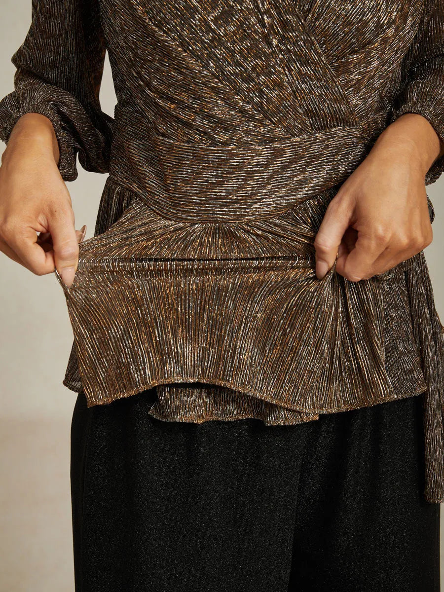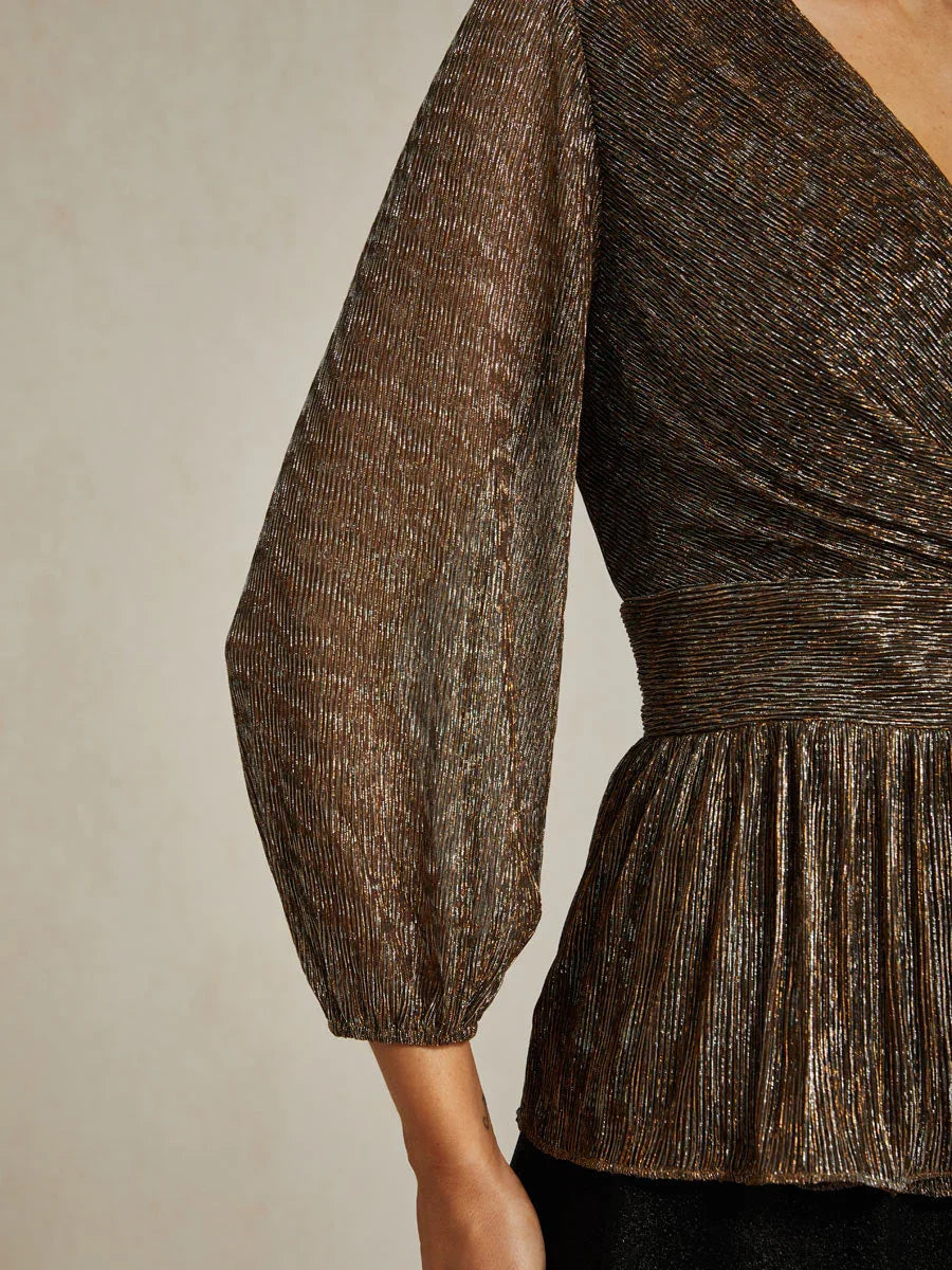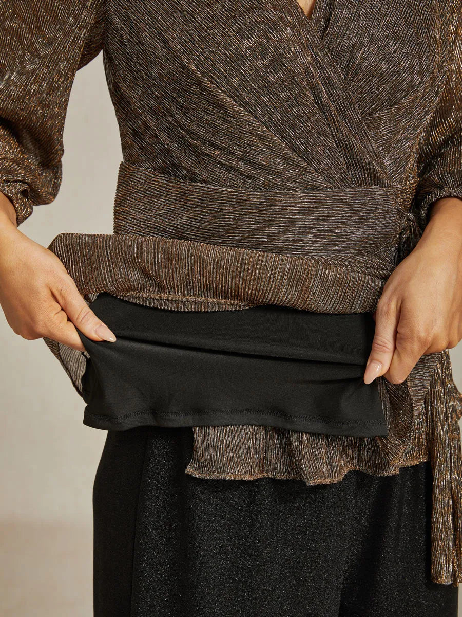 Shine effortlessly in this metallic pleated chiffon wrap top, designed to flatter with a feminine silhouette. The elegant wrap style highlights the waist while offering a graceful drape, complemented by 3/4 sleeves with elastic cuffs and a comfortable stretch lining for all-day comfort. Crafted from?lightweight shimmering pleated chiffon, this blouse brings both sophistication and versatility.Perfect for pairing with skirts, trousers, this versatile piece is ideal for evening events, parties, or festive gatherings.