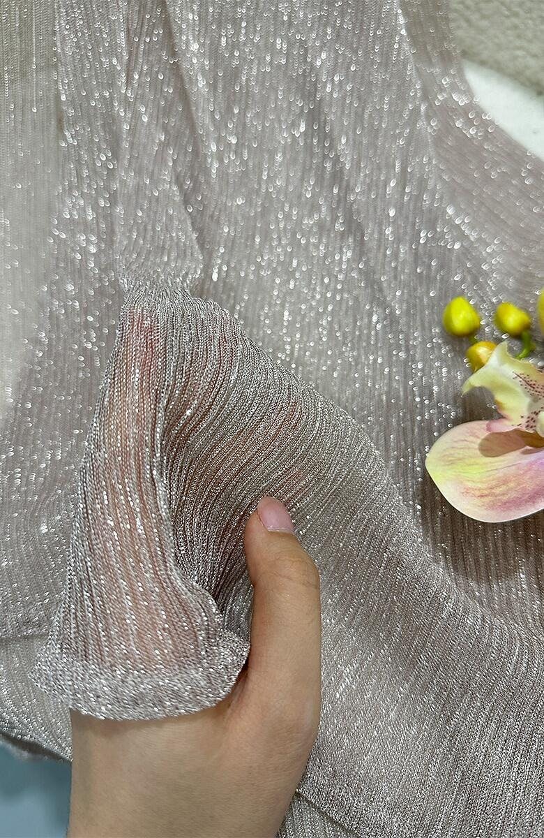 - Fabric: Metallic pleated chiffon, lightweight, subtle shimmer