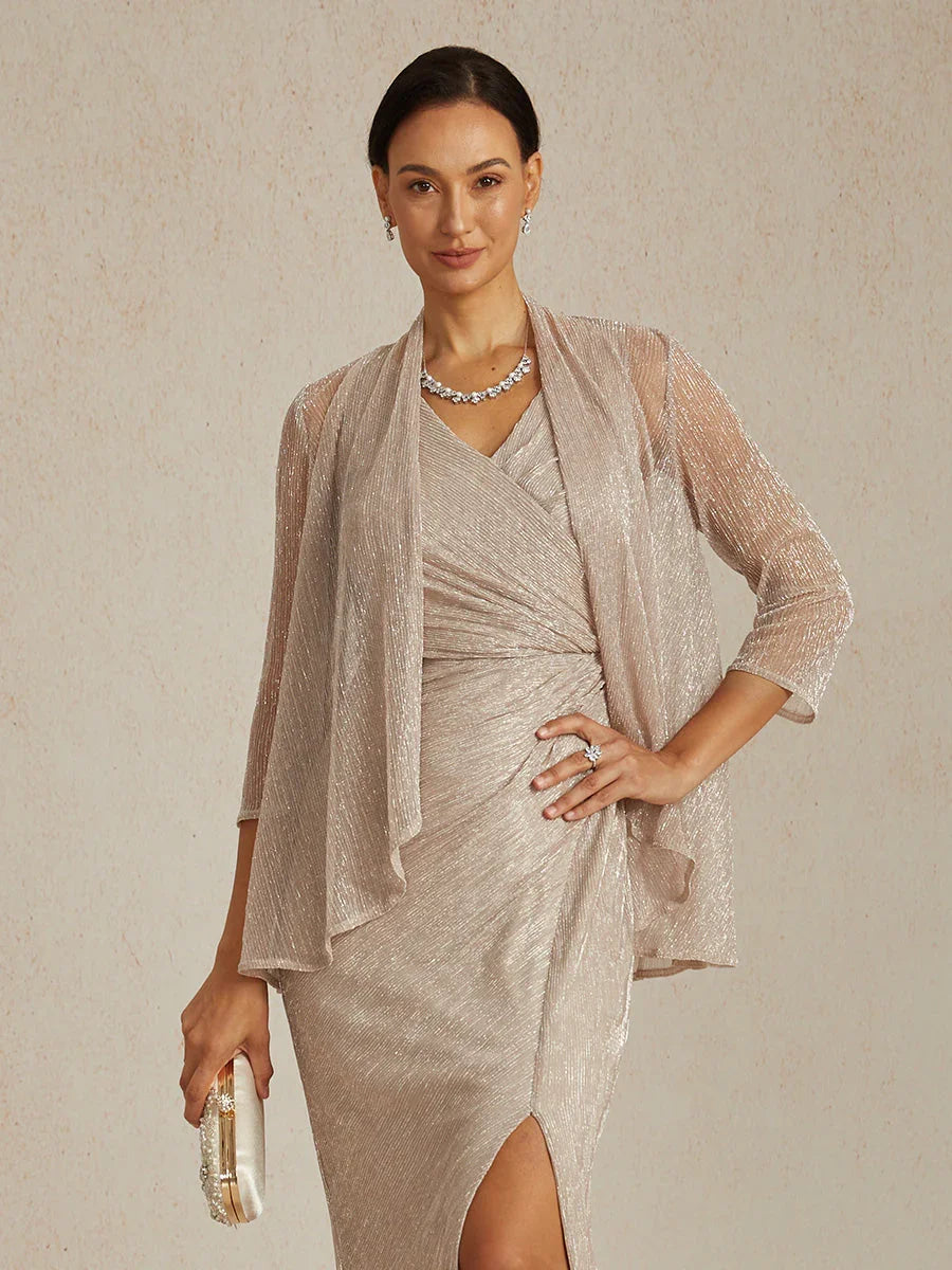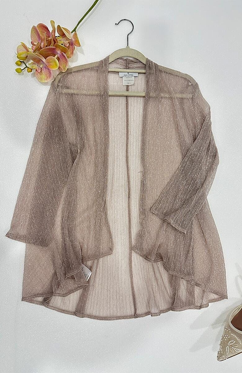 This longline metallic pleated chiffon jacket features a layered design that adds dimension and elegance to any outfit. Lightweight and flowy, it pairs perfectly with the matching metallic pleated chiffon evening dress for a complete, polished look. Ideal for evening events, parties, or formal occasions.