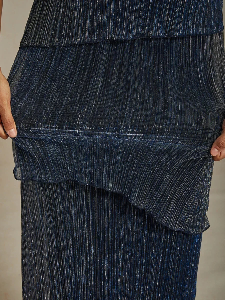 - Fabric: Metallic pleated chiffon, lightweight, subtle shimmer