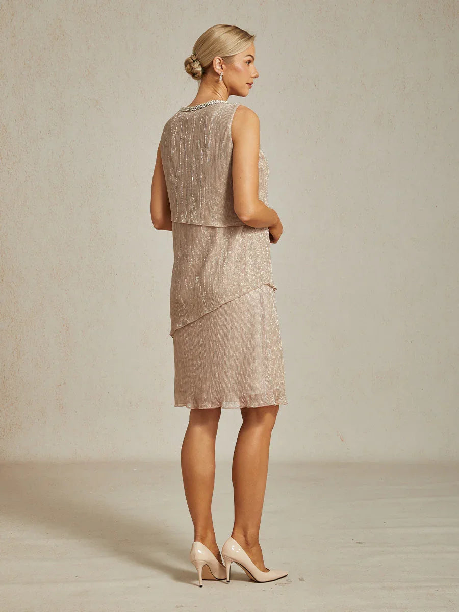 This elegant metallic pleated chiffon midi dress features a beaded round neckline and layered design, adding dimension and sophistication. The stretch lining ensures comfort while maintaining a flattering silhouette. Perfect for evening events, parties, or formal occasions. Can be paired with the matching cardigan for a complete look.