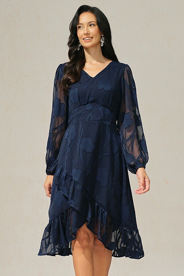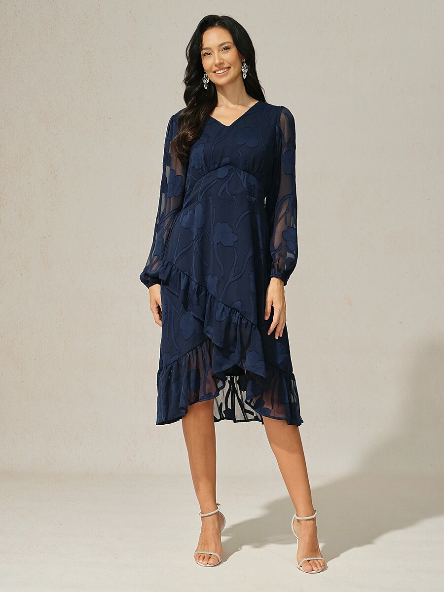 This elegant knee-length dress features a V-neckline and delicate textured fabric for a refined yet breathable feel. Designed with long sleeves, a ruffled hem, and a flattering high waist, the back smocked panel ensures a comfortable and tailored fit. Ideal for women over 45, this dress transitions effortlessly from daytime gatherings to semi-formal events.
