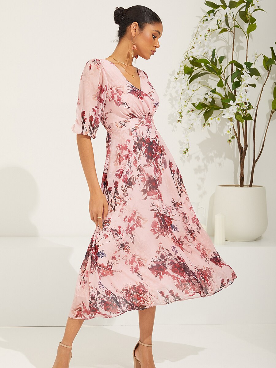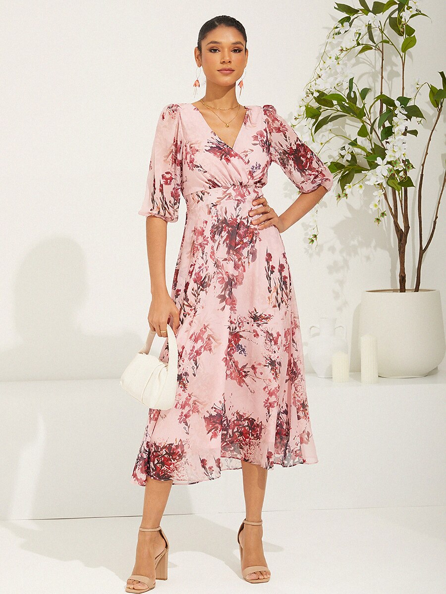 This elegant chiffon dress features a smock design and a floral pattern that adds a stylish touch. With its V-neckline, half puff sleeves, and midi dress length, it??£¤s the perfect choice for occasions like weddings, engagements, or daily wear. Its regular fit ensures comfort while keeping an elegant, chic appearance, making it ideal for fall, summer, or spring.