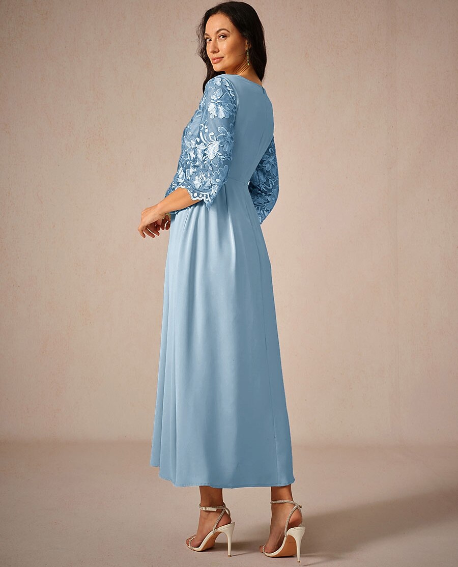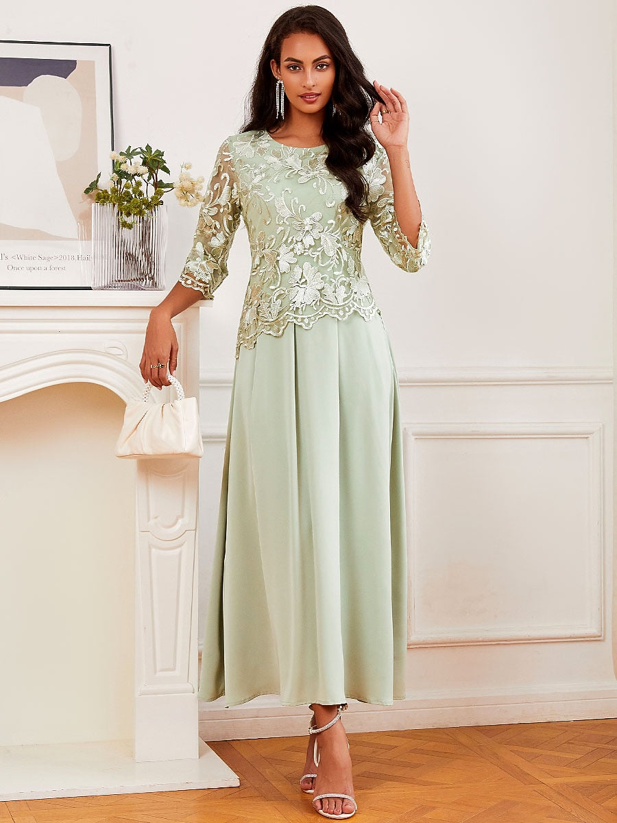 This elegant formal dress combines lace for a sophisticated look. Featuring a crew neck, ruffle and ruched details, and an A-line silhouette, it exudes timeless charm and grace.