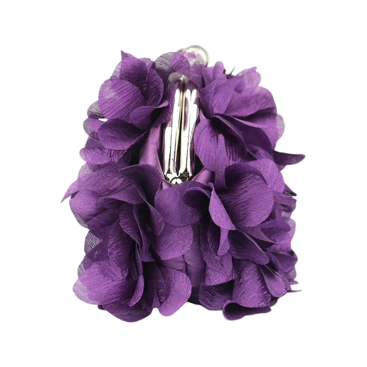 This is a women's clutch purse with a vibrant floral design. It features a 3D flower embellishment, creating a bold and stylish look. The clutch is elegant and perfect for formal occasions, such as weddings, parties, or evening events. Its size is compact, offering enough space for essentials. The color is a rich purple, ideal for making a statement with your outfit
