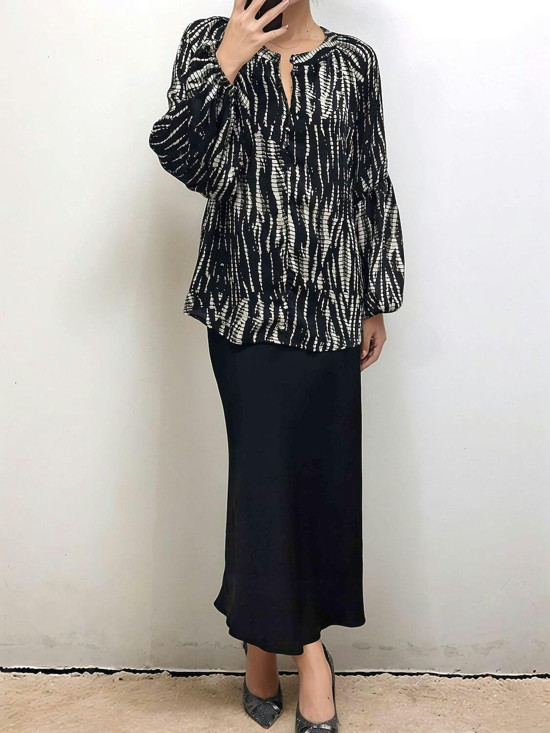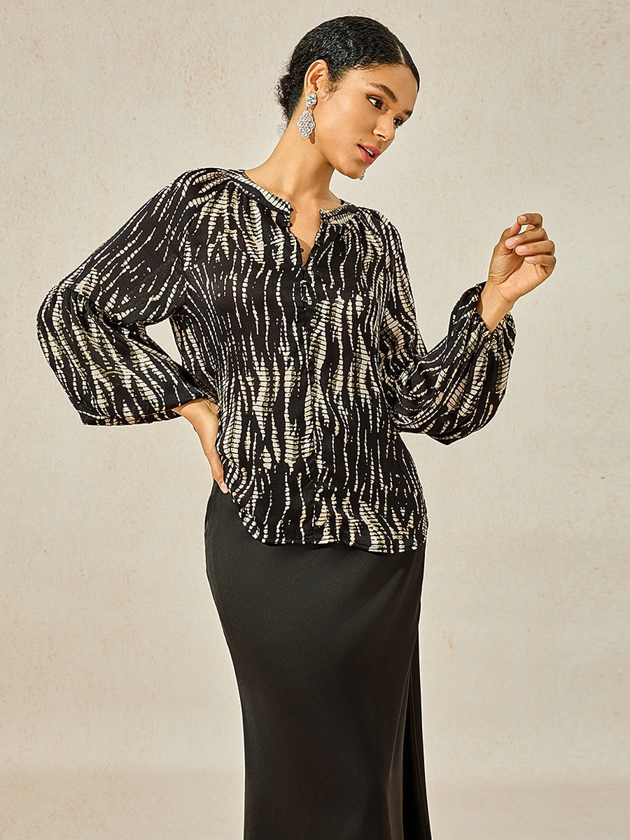 This women's blouse is crafted from a luxurious satin, offering a lightweight and breathable feel for comfortable all-day wear. Designed with a sophisticated notched collar, elegant lantern sleeves, and a striking abstract marble print, this blouse effortlessly combines modern style with timeless elegance.