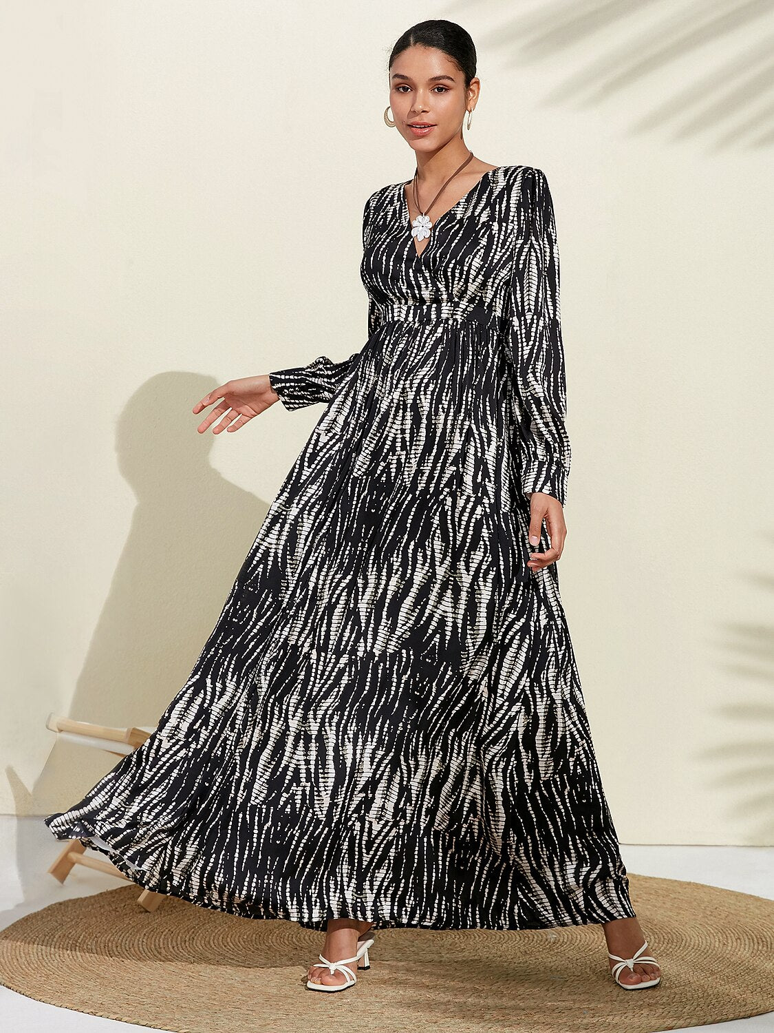 This elegant women's dress is crafted from luxurious satin, offering a smooth, flowing silhouette that ensures both style and comfort. Designed with a timeless A-line shape, it features a modern black and white abstract print, making it a standout piece for various occasions. The V-neckline, gathered pleating, and long sleeves add a touch of sophistication, making it perfect for transitional seasons.
