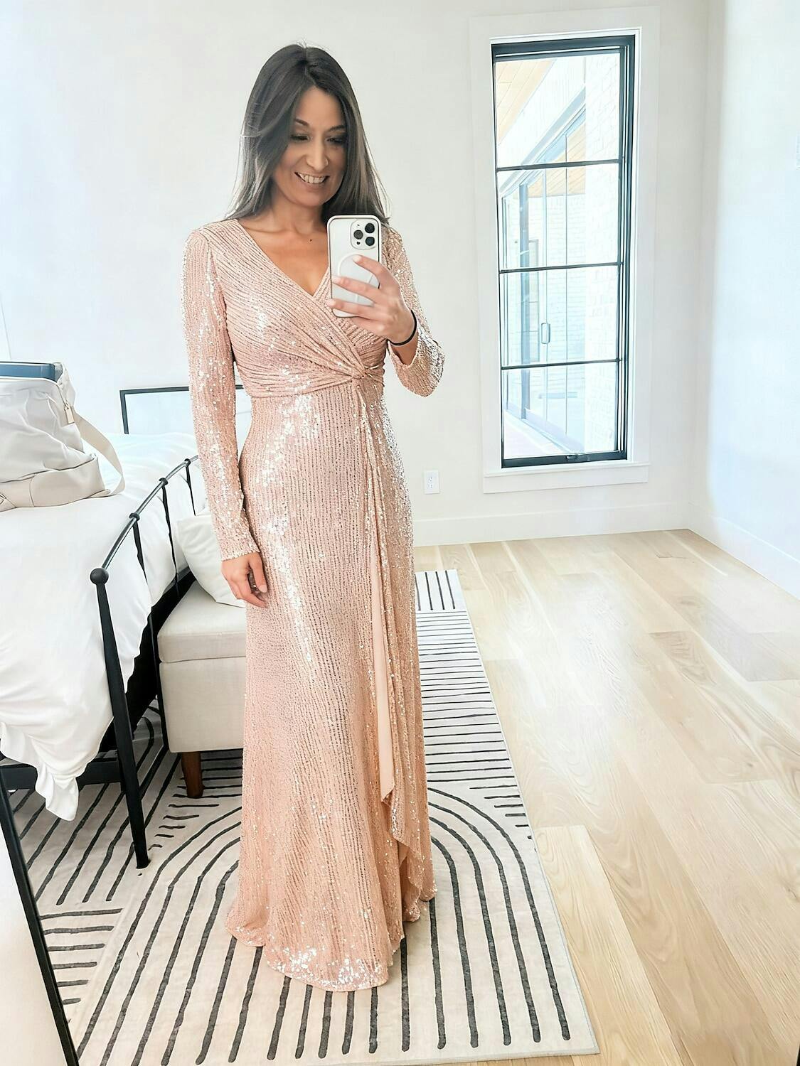 Shine with effortless elegance in this stretch sequin evening gown. The flattering V-neckline and twist-front waist define your silhouette, while the asymmetric design adds a touch of modern glamour ¡ª perfect for mature women who love timeless sparkle and comfort.