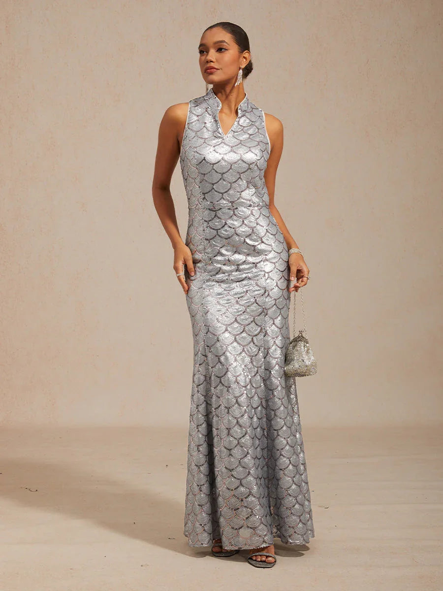 This collared sleeveless mermaid dress is designed to give you an elegant and flattering look. The mid-waist fit provides a sculpted silhouette, while the sequins arranged in a fish scale pattern cover the entire dress, adding a glamorous touch. The slightly stretchable sequined fabric offers a comfortable fit, hugging your curves while allowing for movement. The skirt flares out below the knee, creating a beautiful flow, and the soft high-elastic knit lining ensures comfort.