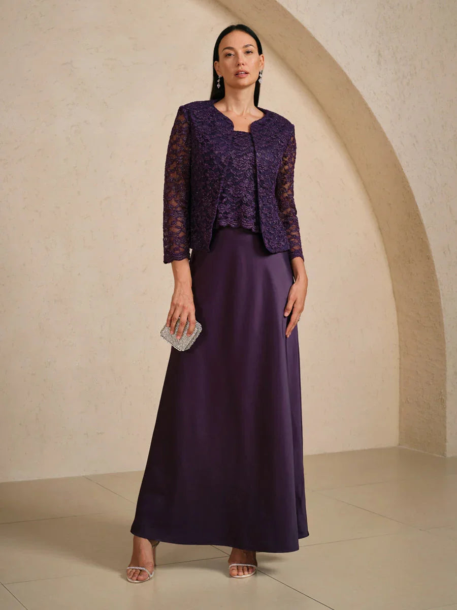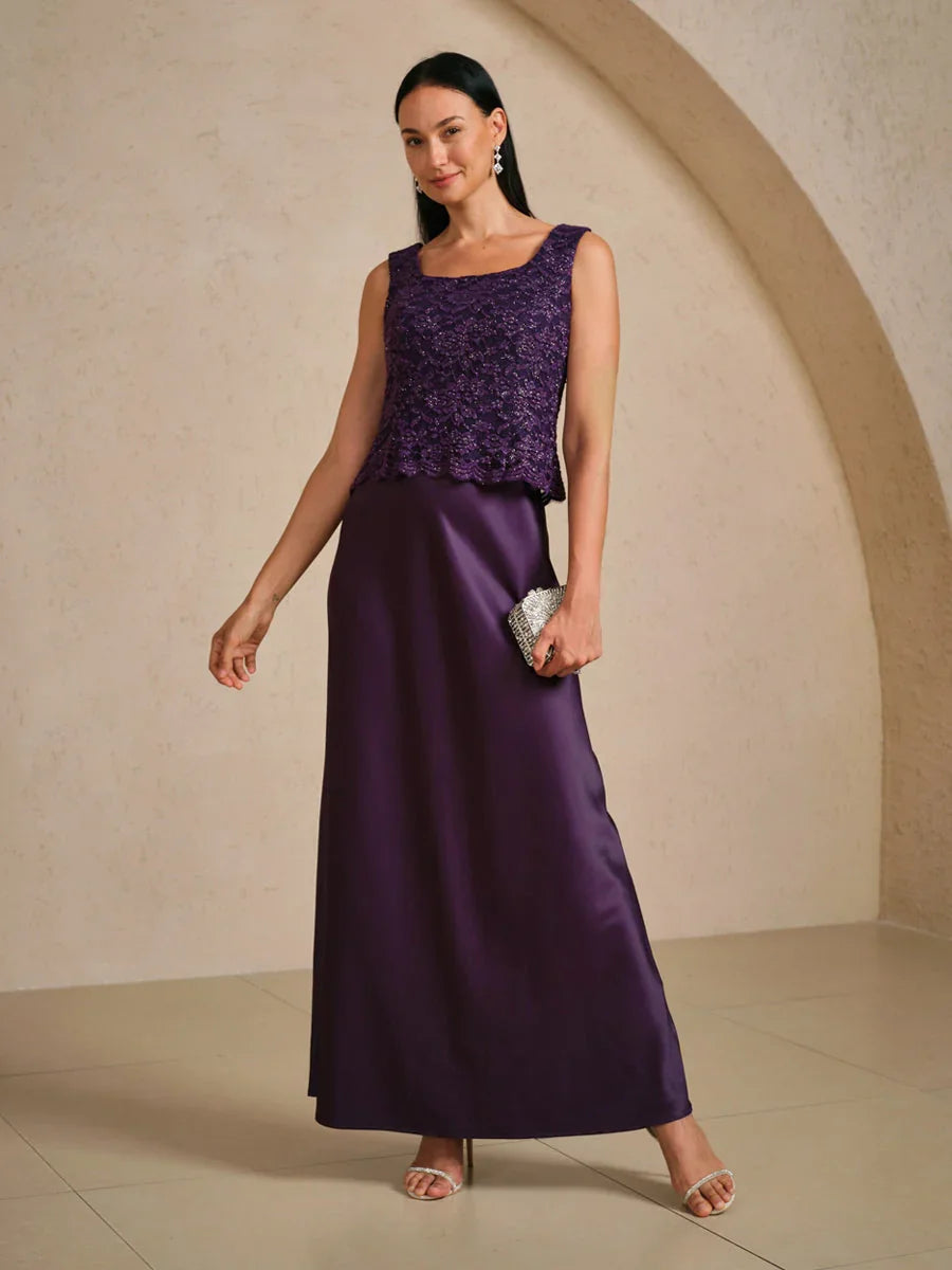 A graceful choice for milestone moments, this sleeveless dress combines shimmering silver glitter on delicate lace paired with smooth?satin to create a refined, feminine silhouette. The flowing A-line skirt flatters every step. Perfect for mothers of the bride, formal celebrations, and evening receptions, this ensemble offers beauty, comfort, and timeless elegance. Style it with understated jewelry and heels for an effortlessly polished finish. Can be paired with the matching jacket for an elegant layered look.