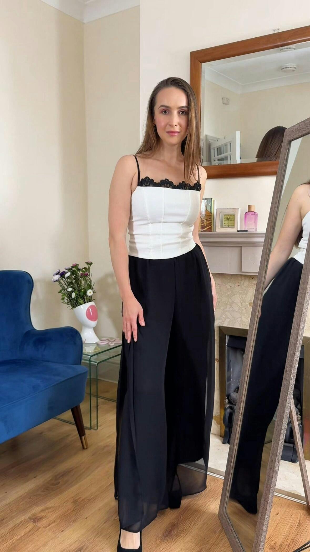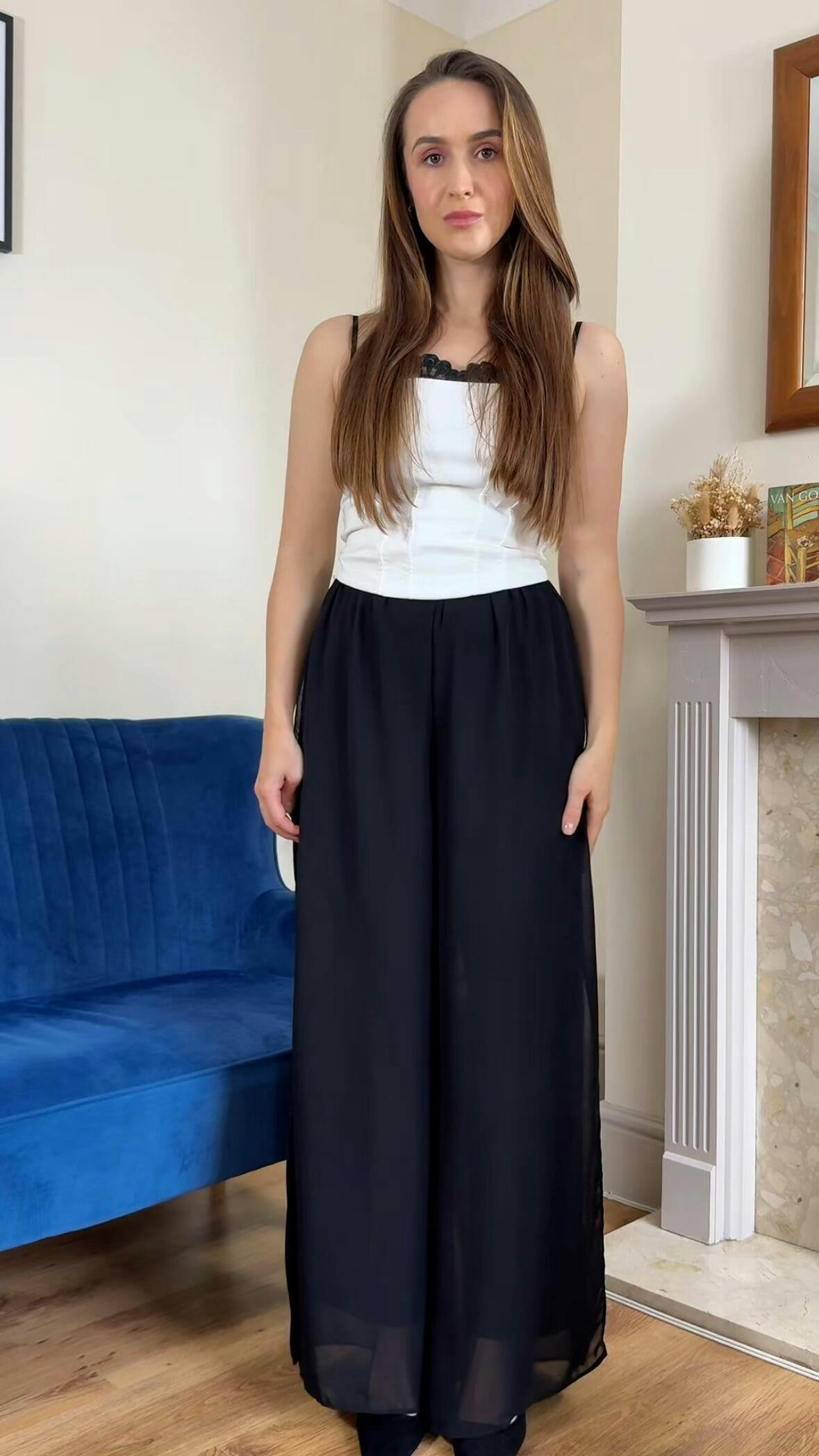 Step into effortless elegance with these straight-leg pants featuring a flowing chiffon split-leg overlay. The design combines comfort and sophistication, with a soft, high-stretch lining for all-day wear. The sheer chiffon overlay adds graceful movement and a touch of drama a perfect for evening events, weddings, banquets, or upscale dinners. Pair them with heels for a refined look, or dress them down with flats for daytime chic.