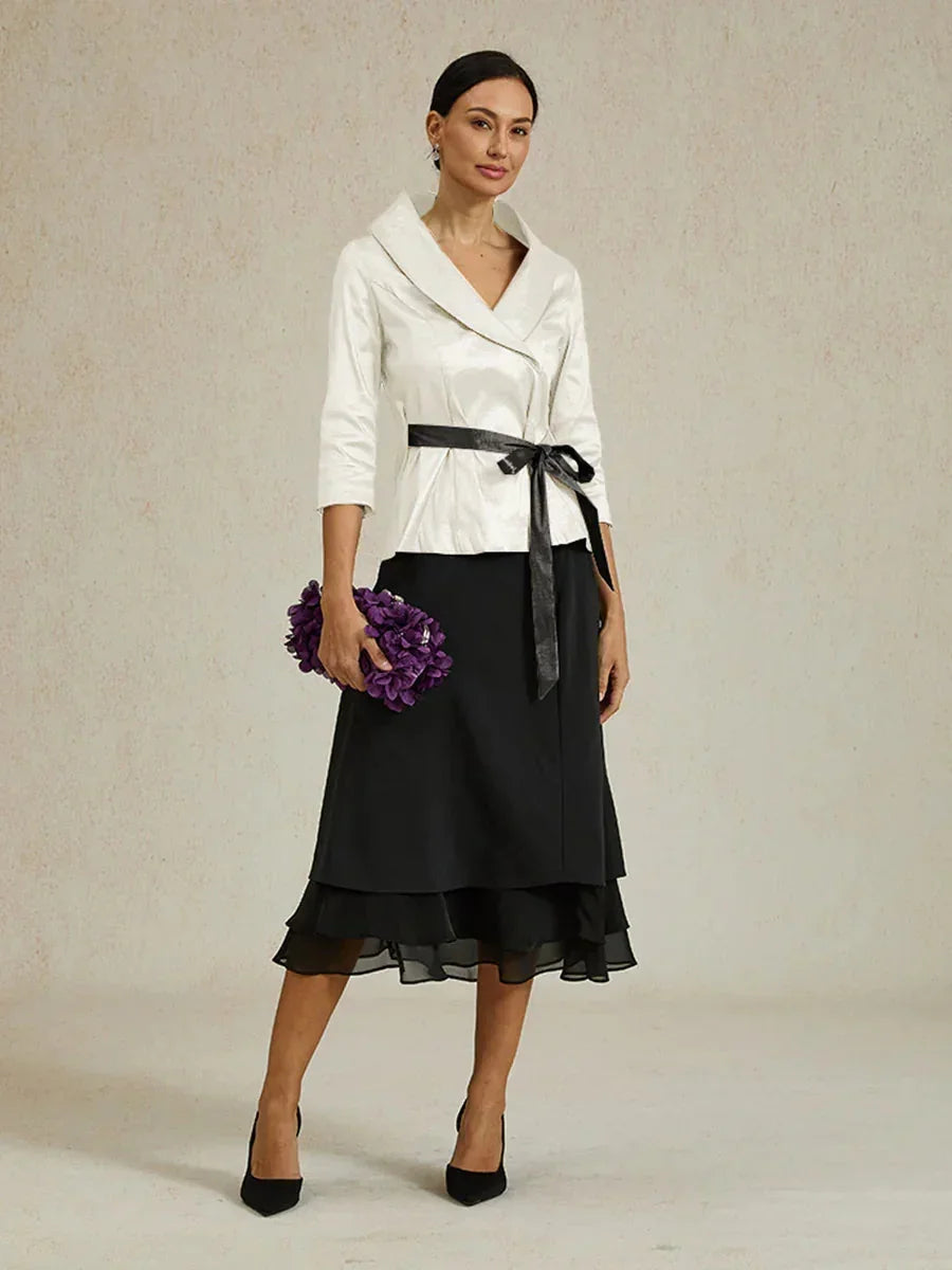 Make a refined statement with this elegant 3/4 sleeve stretch taffeta blouse. Designed with an asymmetric silhouette, this top features a structured collar, a stylish tie-front waist detail, and a hidden back zipper for a smooth fit. The stretch fabric offers comfort without sacrificing shape, making it perfect for special occasions and elevated evenings.