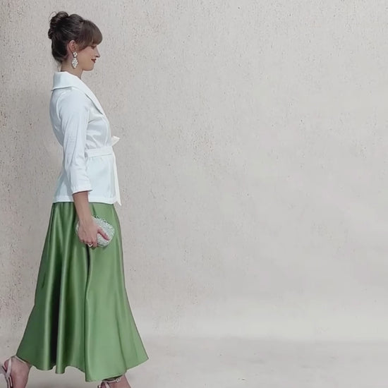 - Fabric : Stretch taffeta, smooth texture, structured feel, medium weight, subtle sheen