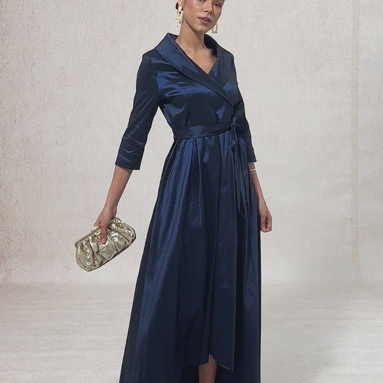 Turn heads in this collar stretch taffeta dress, designed with a playful high low hem and a flattering tie belt that cinches your waist beautifully. Crafted from luxurious stretch taffeta, it hugs your curves while offering comfort and elegance. Whether you're stepping out for a wedding, evening party, or a formal dinner, this dress is your go-to for timeless sophistication. Add heels and a bold necklace to complete the look, and you're sure to shine wherever you go.