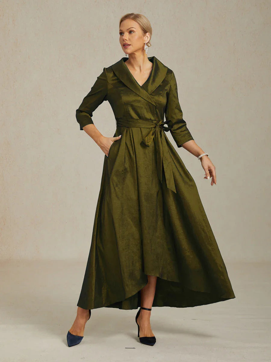 Turn heads in this collar stretch taffeta dress, designed with a playful high low hem and a flattering tie belt that cinches your waist beautifully. Crafted from luxurious stretch taffeta, it hugs your curves while offering comfort and elegance. Whether you¡¯re stepping out for a wedding, evening party, or a formal dinner, this dress is your go-to for timeless sophistication. Add heels and a bold necklace to complete the look, and you¡¯re sure to shine wherever you go.