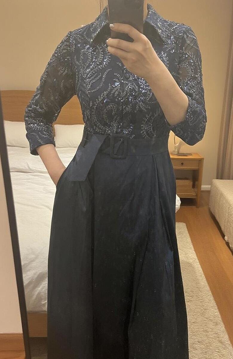This sophisticated long A-line dress is designed with exquisite details for both elegance and practicality. The paisley-patterned sequin embroidered bodice adds a luxurious touch, while the structured silhouette flows into a graceful full-length skirt. Designed with a front opening and a convenient back zipper, this gown is easy to wear. Functional side pockets add modern utility, and the detachable belt allows you to style the waistline to your preference. Perfect for weddings, formal dinners, and evening celebrations, this dress combines timeless beauty with thoughtful comfort.