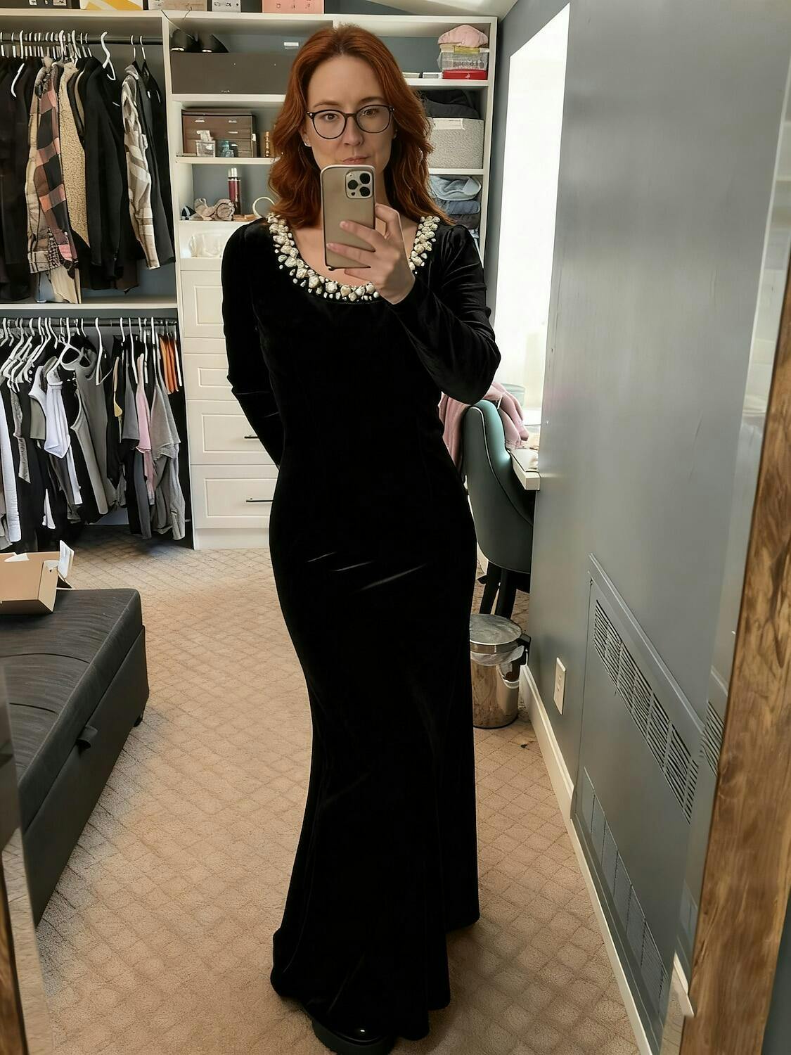 Stretch Velvet Evening Gown with Rhinestone Embellished