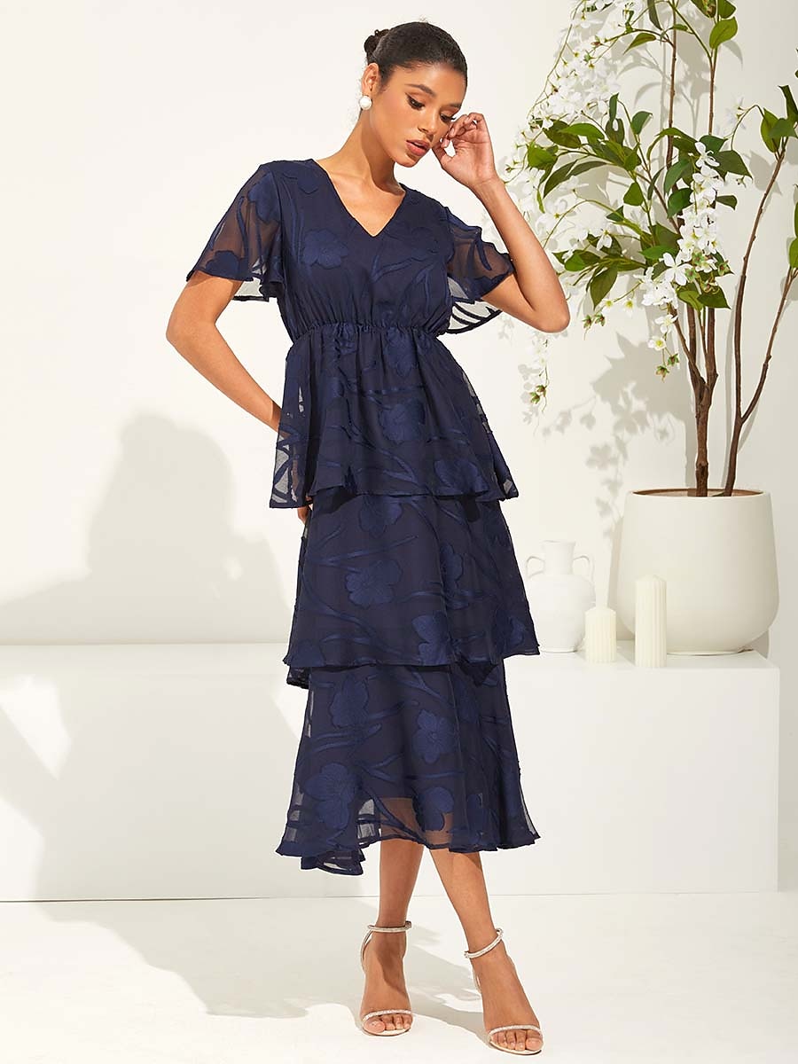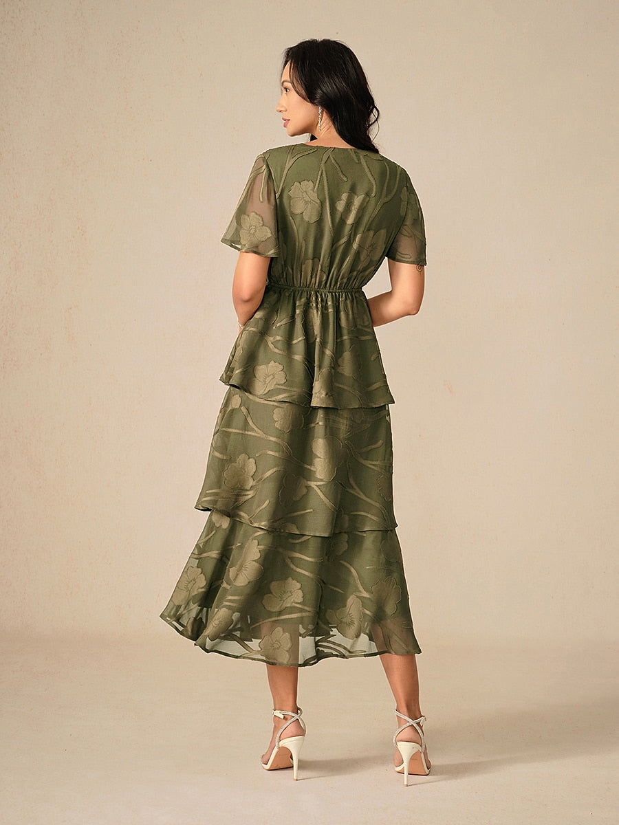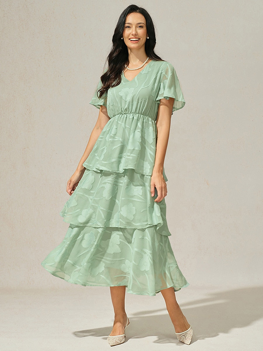 This elegant A-line dress is the perfect choice for a wedding guest or cocktail party. The ruffle design and V-neckline create a chic, flattering look, while the micro-elastic fabric ensures comfort throughout the event. The flutter sleeves add a delicate touch, making this dress a summer must-have.