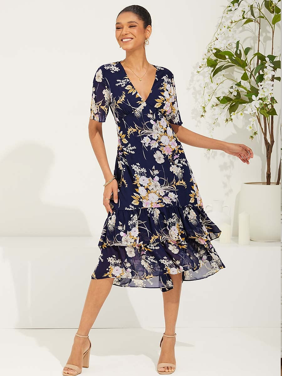 Floral Cowl Neck Tea-Length Dress with Flounce Hem