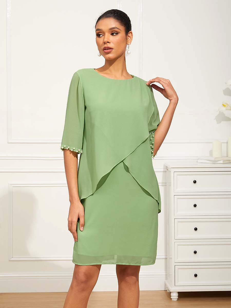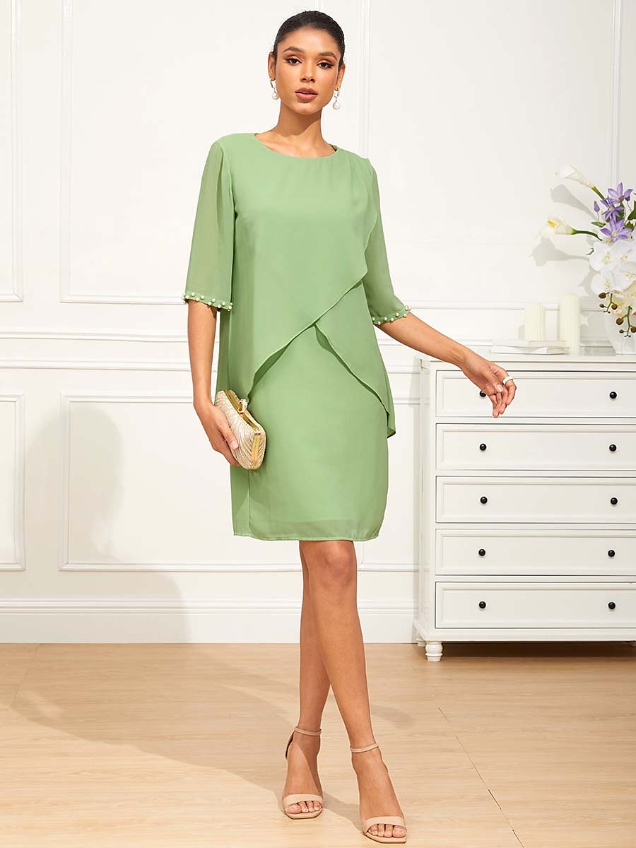 This elegant chiffon dress is perfect for a wedding guest or cocktail party. The asymmetrical hem adds a modern twist to the classic design, while the crew neckline and 3/4 length sleeves offer a sophisticated and comfortable fit. Ideal for spring or summer occasions.
