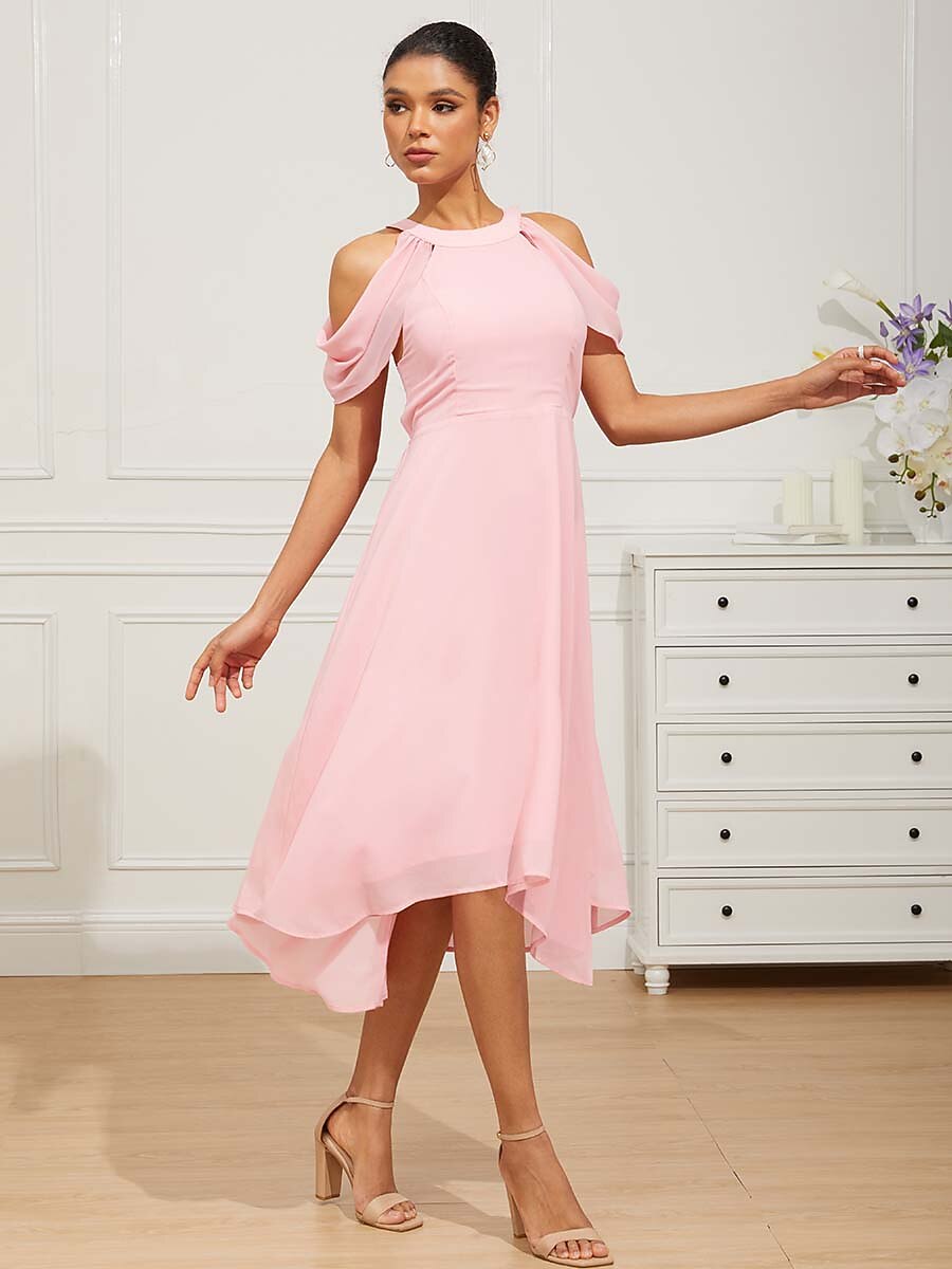 This elegant chiffon dress features a stunning asymmetrical hem, adding a modern twist to its timeless charm. The halter neck design highlights the shoulders, while the flutter sleeves and 3/4 length add a soft, feminine touch. Perfect for wedding guests or cocktail parties, this dress combines sophistication and comfort, making it ideal for spring and summer events.