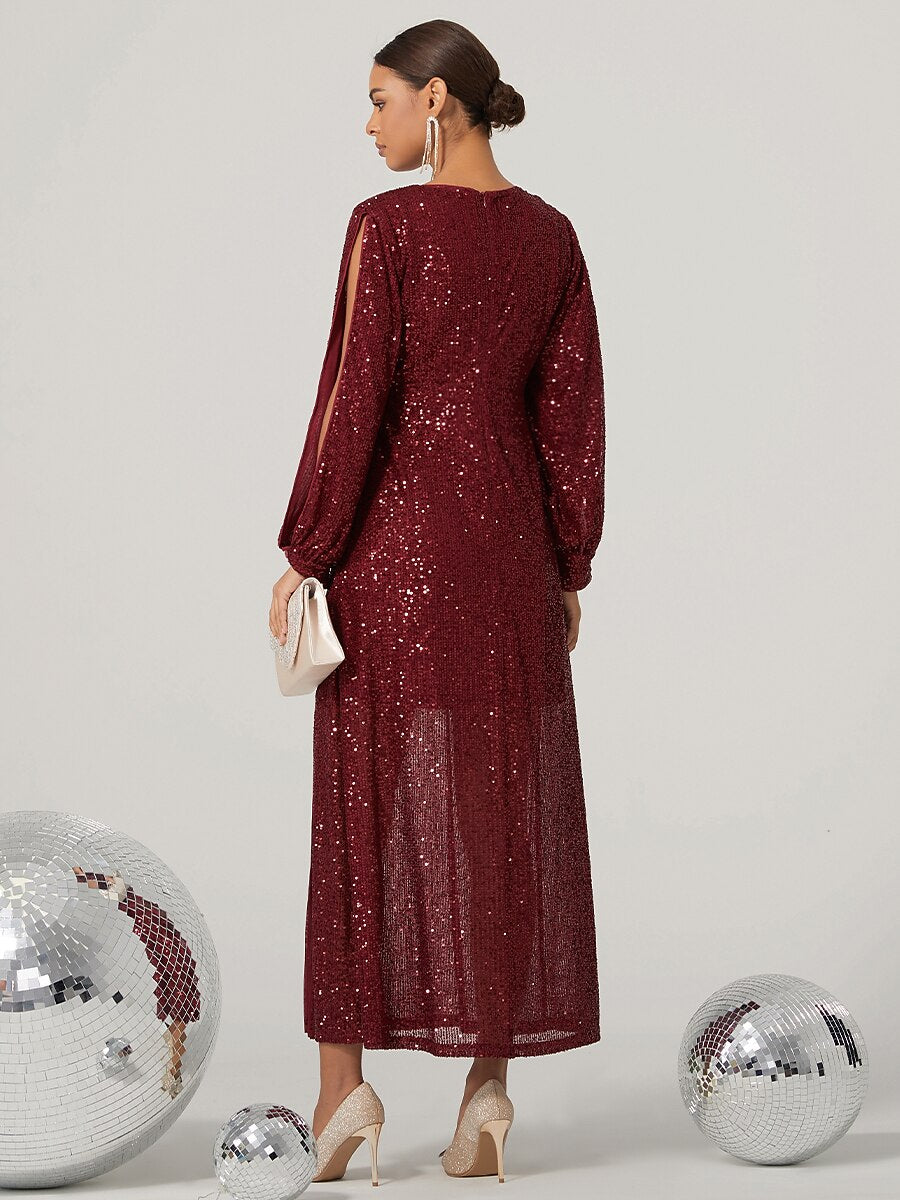 This elegant vintage maxi dress features a dazzling sequined design with a daring split thigh and a flattering V-neck. The bishop sleeves add a dramatic touch, making it perfect for a cocktail party in winter and fall.