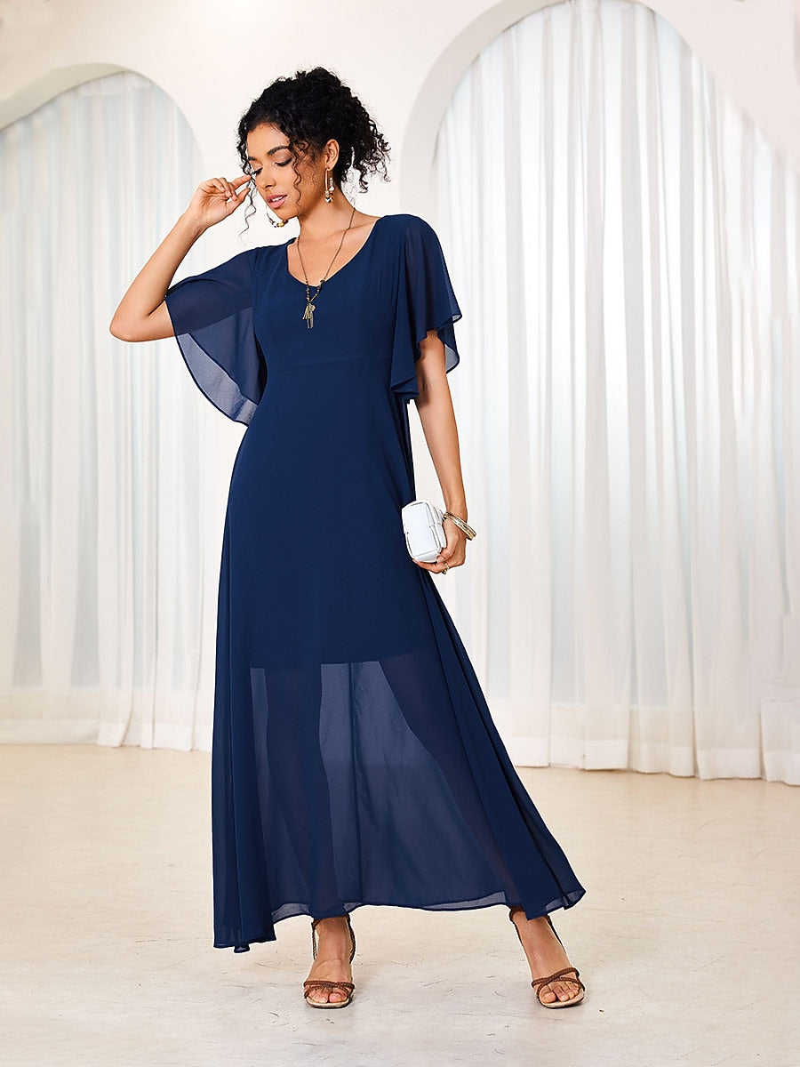 This elegant A-line dress is crafted from chiffon and designed for special occasions such as weddings or cocktail parties. Featuring a flattering V-neckline and flutter sleeves, it has a ruffle design that adds a feminine touch. The maxi dress length and regular fit offer both comfort and style, perfect for summer events.