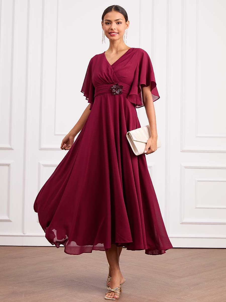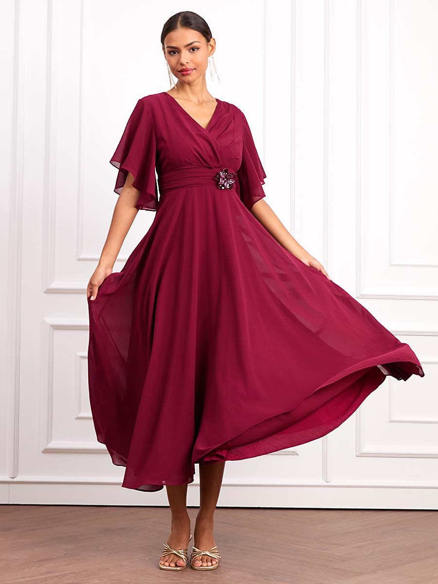 This maxi wrap dress is perfect for a wedding guest or cocktail party. Made from elegant chiffon, it features a ruffle design and a flattering V-neckline. The plain pattern adds to its timeless appeal, while the regular fit ensures comfort and style. Ideal for summer, this dress is a stunning choice for formal or sophisticated events.